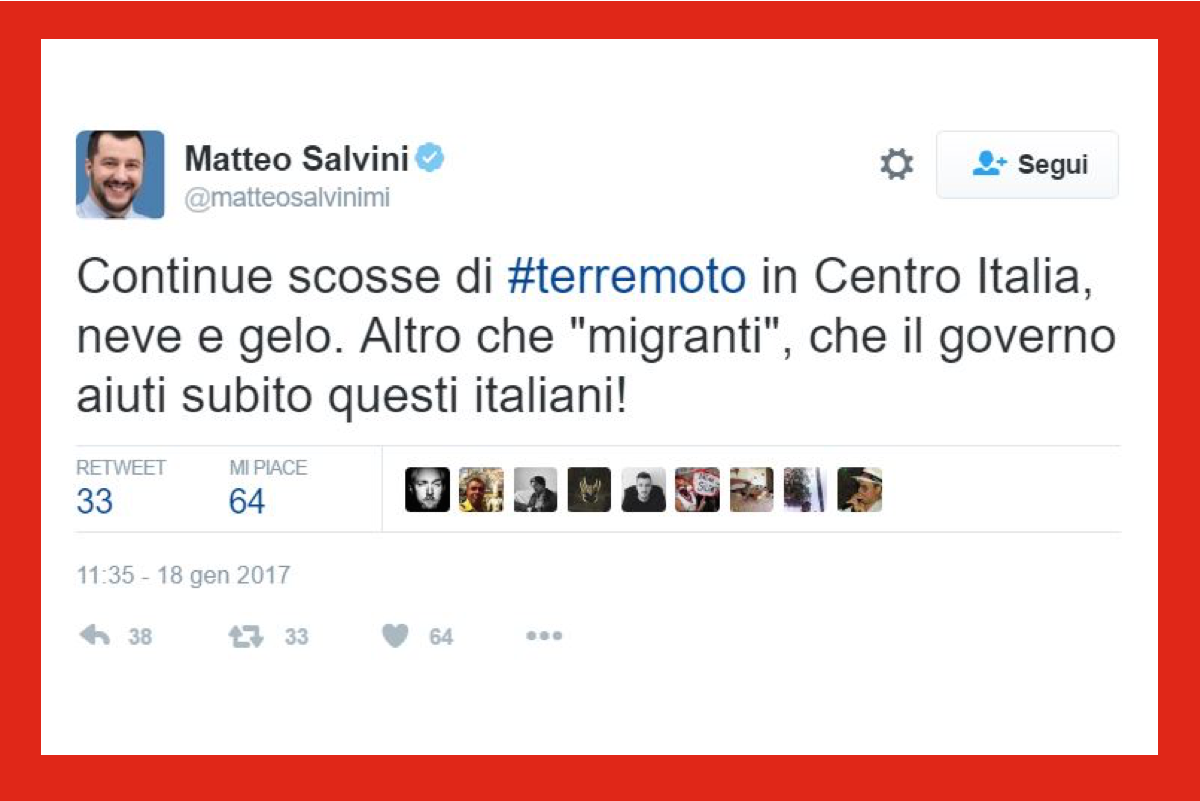 Qui nelle zone terremotate c’è bisogno di tutto tranne che di Salvini, scriveva ieri la deputata Beatrice Brignone. Quando la natura decide di ostinarsi con lo scompiglio gli avvoltoi sono solo i vigliacchi predatori delle briciole di rabbia che cadono dalla disperazione. Scrivere pochi minuti dopo l’ennesima scossa di terremoto che appiattisce gli scheletri delle case in territori accampati «Continue scosse di #terremoto in Centro Italia, neve e gelo. Altro che “migranti”, che il governo aiuti subito questi italiani!» è una volo in picchiata da sciacallo vigliacco.Fare campagna elettorale sulla distruzione e il fiaccamento della speranza è un gioco che non funziona più, caro Matteo. Puoi grattare lo stomaco di chi ha ancora un briciolo di miseria e di ignoranza per rispondere alla tua chiamata alla guerra da disperati ma sarà un gioco breve perché prima o poi vinceranno la misura e la memoria.La misura dice che un conato sugli immigrati non ha niente a che vedere con la cura attiva degli italiani. Se tu ti occupassi di loro avresti molto meno tempo per rilanciare le false notizie di falsi stupri di quegli altri per occuparti di politiche attive in difesa dei tuoi. La rabbia è comandante di un esercito pronto a tradire al prossimo imbonitore e la tua invettiva suona ormai come una litania bolsa e insulsa.Che hai fatto tu, Salvini, per i terremotati? Quando in Europa si votava per i fondi per i terremotati tu, viscido Matteo, eri assente per qualche tua acrobazia da imbonitore. Parli e non voti. Recrimini e non fai il tuo mestiere. Sei un clandestino del Parlamento Europeo e sei a capo di un partito che in diamanti c’è costato più di qualsiasi orda di immigrati.Caro sciacallo, l’essere Salvini non ti perdona. Passerai presto come passano i politici, frantumato da un Bossi redivivo o da un Berlusconi che ti rimetterà a cuccia, e i tuoi cani arrabbiati verrano a morderti.